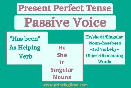 “Has been” is used as helping verb in Present Perfect Tense (Passive Voice) sentences with singular number of nounsand pronouns. Thus, Present Perfect Tense (Passive Voice) sentences with “has been” have the following general sentence formula.