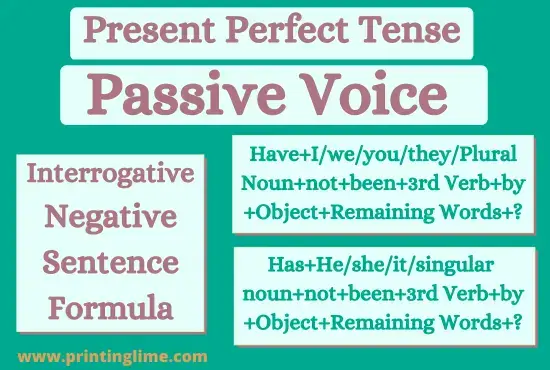 Following are the sentence formula for Declarative, Negative, Interrogative, and Interrogative-Negative sentences of Present Perfect Tense (Passive Voice).